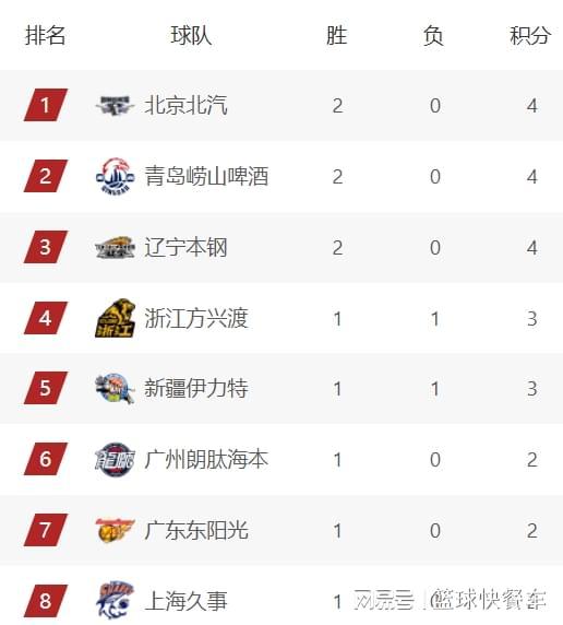 CBA常规赛第2轮先赛三场,北京、辽宁以及青岛在这一轮比赛都获得大胜,北京队以大比分的优势击败了新疆队,成功收获两连胜,而辽宁队也以16分的优势爆冷掀翻广厦,将卫冕冠军斩于马下