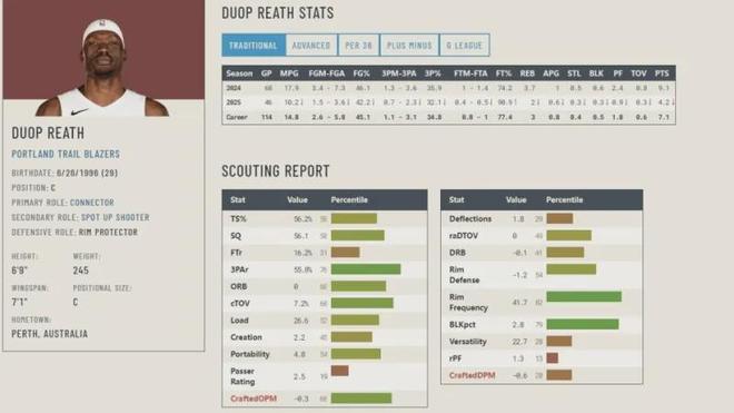 Portability可移植性,球员在不同阵容中的适配度,得分4.8,超越联盟53%球员,他属于空间投射中锋,其进攻阵容适配度还是非常不错的。