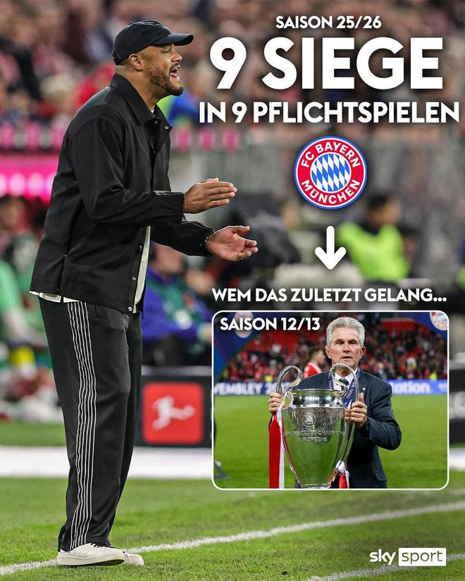 据统计,拜仁在新赛季前9场比赛中保持全胜,他们上一次取得这样出色的开局要追溯到2012-13赛季,那个赛季海因克斯带领拜仁赢得欧冠、德甲、德国杯三冠王。