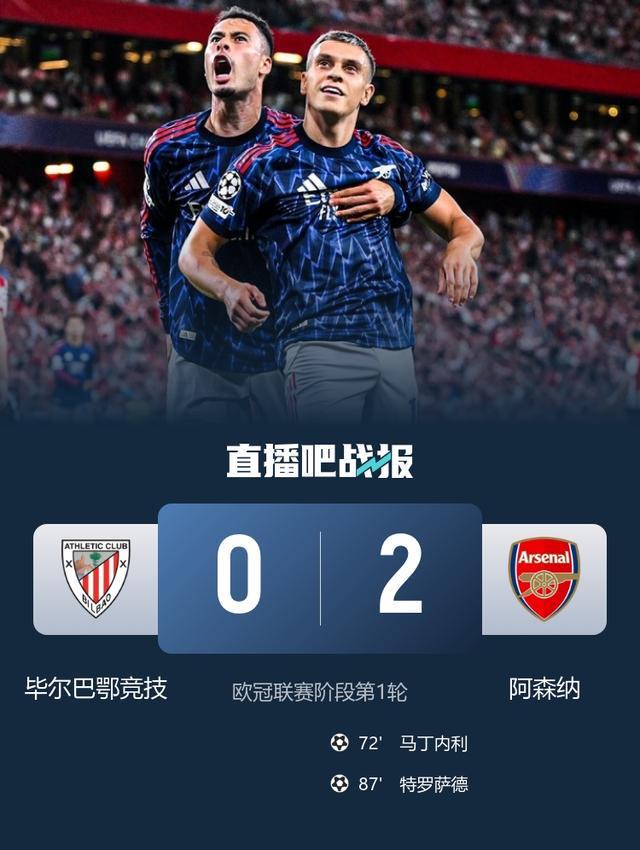 马丁内利、特罗萨德替补互相传射,阿森纳2-0击败毕尔巴鄂竞技,新赛季欧冠开门红!