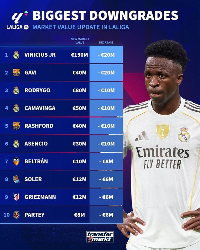 在更新了西甲球员身价后,德国转会市场网站列出西甲球员身价下跌榜前十,维尼修斯、加维下跌2000万欧最多。