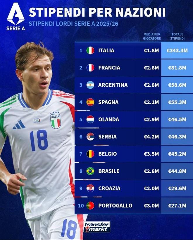 德国转会市场对意甲球员的薪资情况进行了盘点,意大利球员总薪资最高,而塞尔维亚球员的平均年薪最高的。