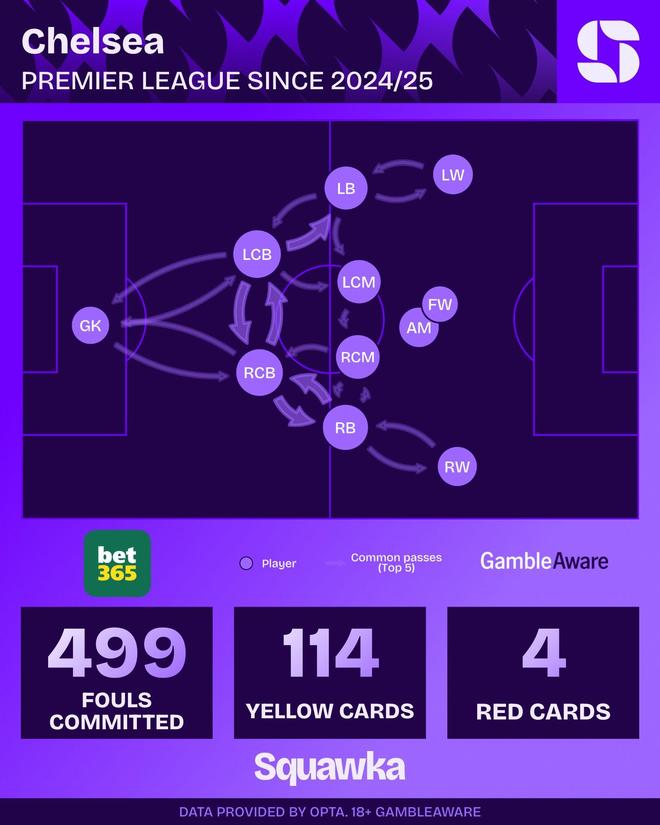 据数据机构Squawka统计,自24-25赛季至今,切尔西在英超联赛中已领到114张黄牌与4张红牌,是同期所有英超球队中领牌数量最多的。数据显示,自2024-25赛季至今,切尔西已成为联赛中得