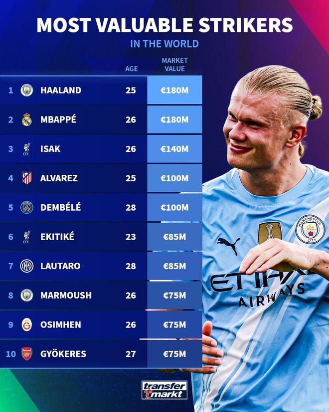 - 在完成最新一次身价更新后,德国转会市场网站列出了世界足坛中锋身价榜,哈兰德1.8亿欧居首,姆巴佩紧随其后。德...发表于: 11-03 11:34