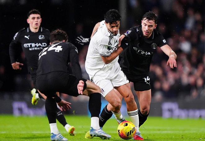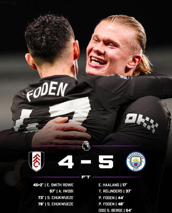 易边再战不到3分钟,曼城又打出一波精妙反击:第48分钟,福登梅开二度,比分4-1;随后,多库的内切兜射折射破门,5-1。正常情况下,比赛应该就此终止悬念。然而富勒姆忽然打出血性,用21分钟连扳三球,几乎完成史诗级逆转:第57分钟:伊沃比兜射破门,5-2;第73分钟:丘库埃泽抽射进球,5-3;第78分钟:丘库埃泽复制进球,梅开二度,5-4!曼城从5-1到5-4,后防连续断电,险些成为本赛季最大的笑柄。本场9球,是本赛季英超单场进球最多的比赛。