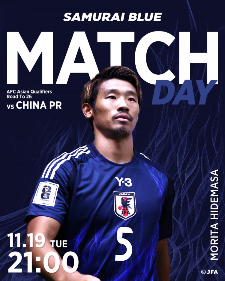 赛前日本队官推公布了本场比赛的海报,中场球员守田英正单人入镜。日本队官推配文写道:“在18强赛至今未尝败绩的日本队,将作客对战中国队。2024年国家队比赛最后一战,朝着胜利前进