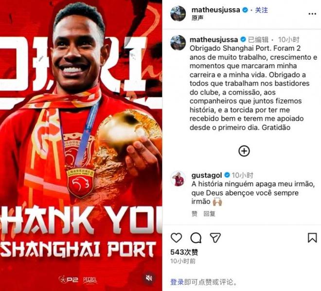 今天上午,上海海港外援茹萨在个人社交账号上发文告别上海海港。其表示加盟上港的两年让他的事业和生活更加精彩,并感谢并肩作战、创造历史的队友和球迷。